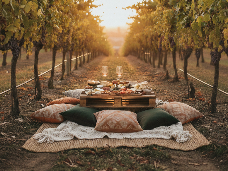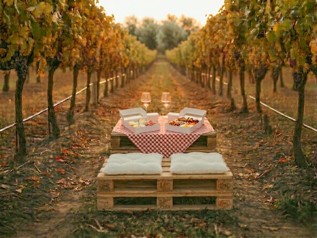Il tuo posto è già assegnato: una coperta sull’erba, cassette di legno come appoggio e un filo di luci che crea la tua “stanza” tra le viti. L’atmosfera è disegnata per chi non cerca il chiasso, ma l’emozione. Niente musica dal vivo che copre i pensieri, solo un sottofondo Jazz diffuso che accompagna la serata senza invaderla. Tu arrivi e il mondo resta fuori.