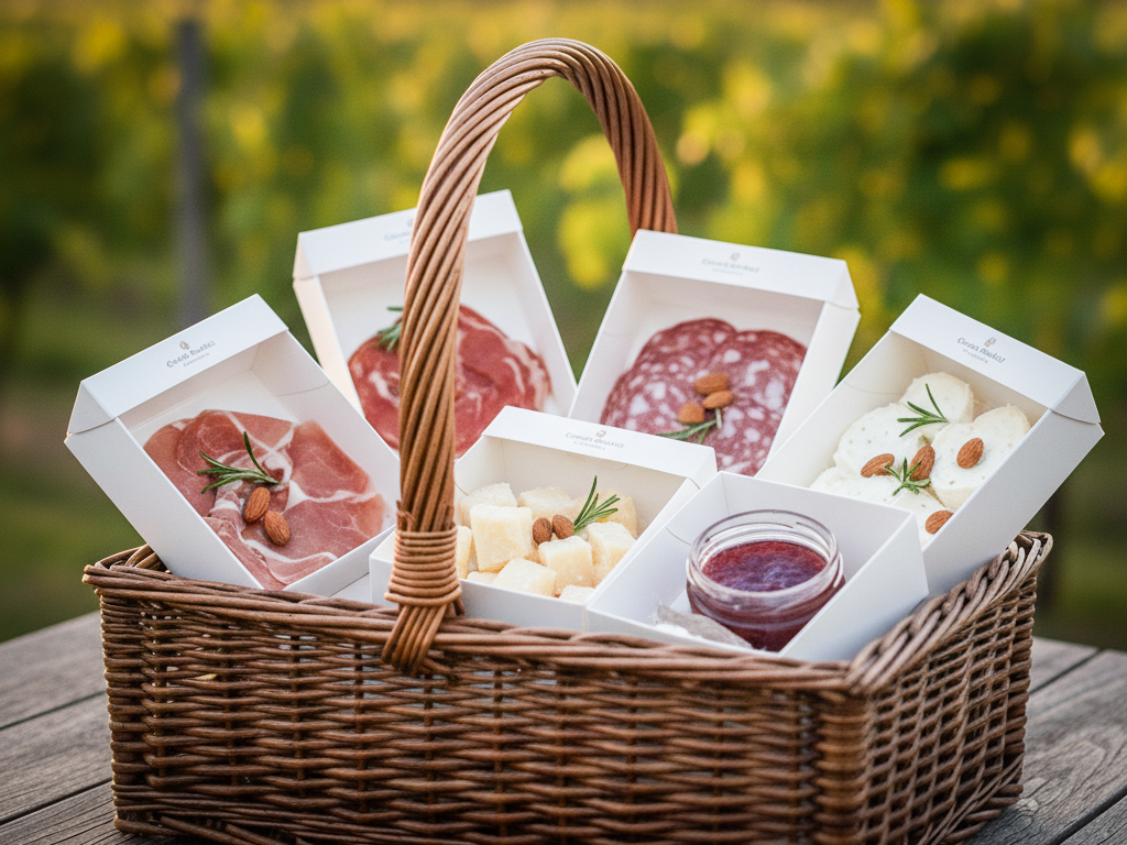 Arriverà un cestino con scatole bianche, minimali, pulite. Ma quando le apri, esplode il territorio. Abbiamo scelto Corrado Benedetti per accompagnare i nostri vini: salumi affinati nelle grotte della Lessinia, formaggi d’alpeggio, sapori antichi e decisi. È tutto già tagliato, porzionato, pronto. Non devi “lavorare”, devi solo assaporare l’eccellenza.